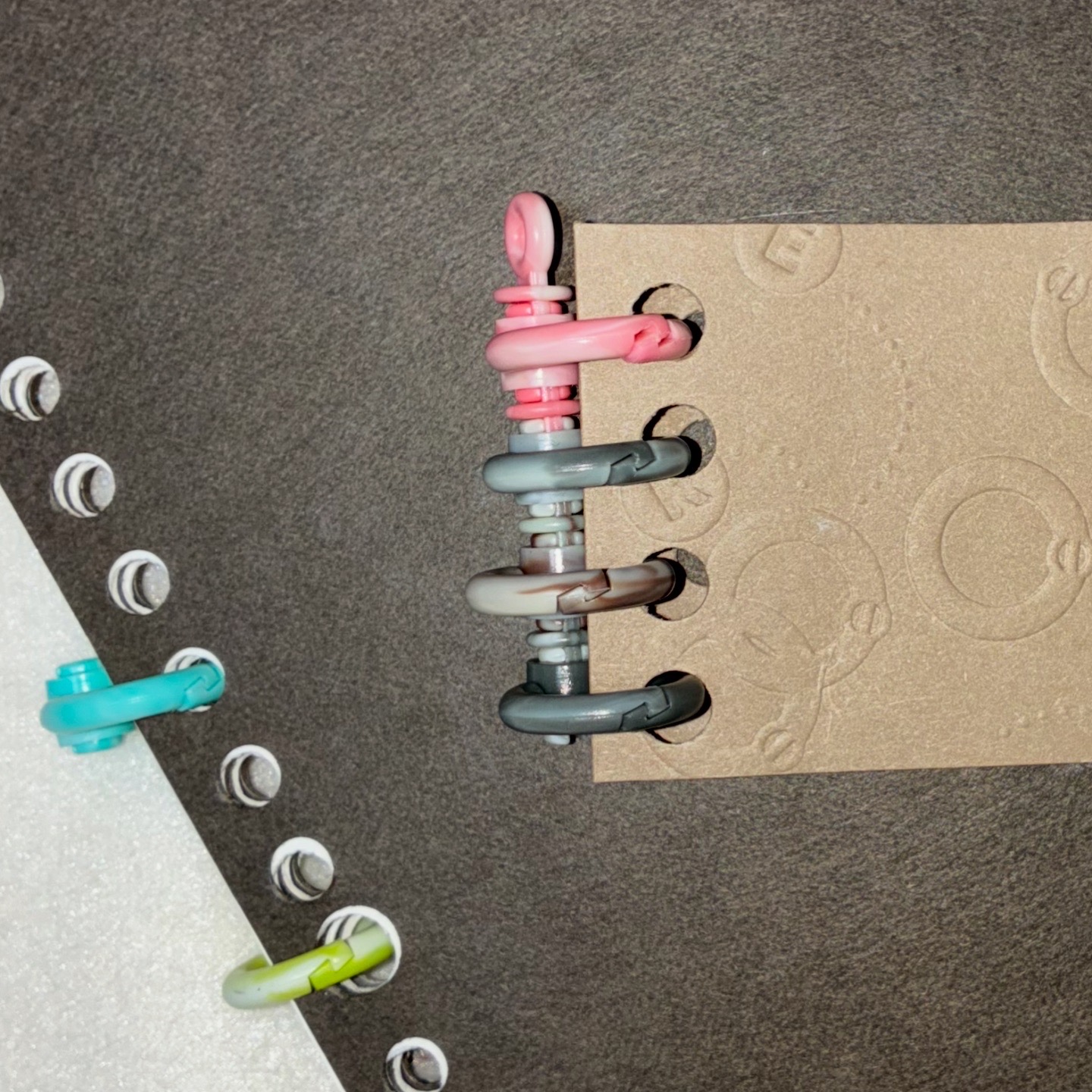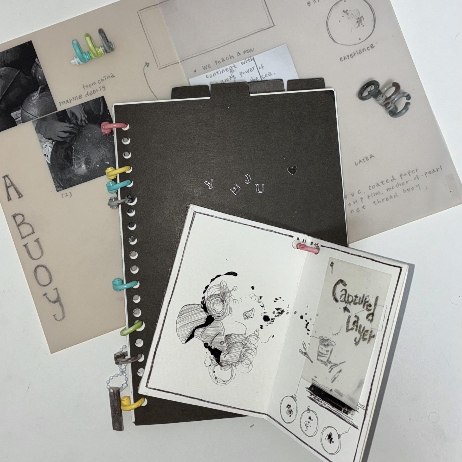 폐부표를 이용한 작품 전시에 사용한 책자들을 연결하여 보관하기 위해 플라스틱링을 사용. ‘모양새가 바뀌어 새출발을 하는 재료를 응원하는 것’ 이라는 본 작업 취지에도 잘 맞았던 작업.