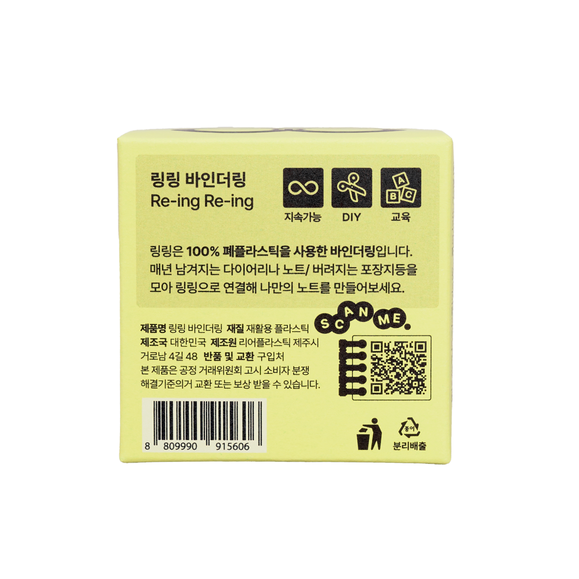 링링(Re-ing Re-ing)은 100% 폐플라스틱 바인더 링으로,무한대 기호처럼 끝없이 순환하는 형태에서 출발한 제품입니다.